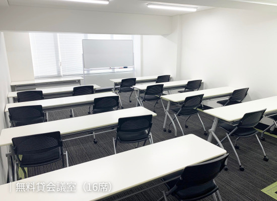 ↑16席・ホワイドボード付きの会議室が無料で使える!